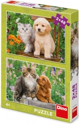 Podwójny zestaw puzzli dla dzieci z motywami uroczych szczeniąt i kociąt oferuje dwie układanki po 48 elementów. Idealne dla dzieci od 4 lat – podczas układania ćwiczą małą motorykę, wyobraźnię oraz zdolność koncentracji. Wysokiej jakości, bezpieczna dla zdrowia tektura i czeska produkcja gwarantują bezpieczną i radosną zabawę.