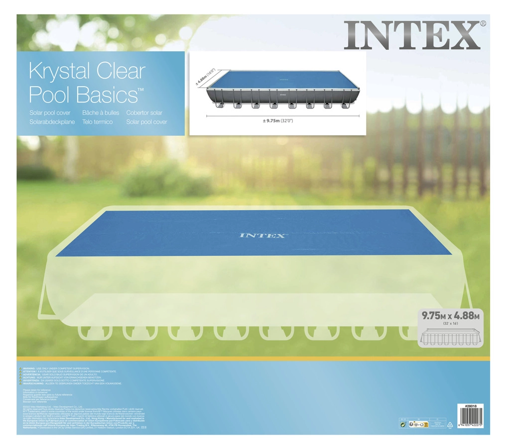 Solarny pokrowiec na basen Intex to idealny wybór do utrzymania temperatury wody w basenie i ograniczenia parowania. Pokrowiec przeznaczony jest do basenów o wymiarach 9,75 × 4,88 m, co odpowiada rozmiarowi 960 × 466 cm.