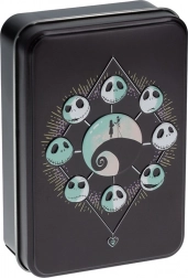 Czarne metalowe pudełko z motywem Jacka Skellingtona i Sally jest idealne do przechowywania i utrzymuje karty w bezpieczeństwie.