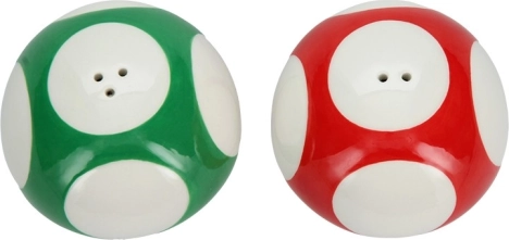 Wprowadź do swojej kuchni figlarny styl dzięki temu zestawowi ceramicznej solniczki i pieprzniczki inspirowanemu światem Super Mario. Para grzybków w kultowych kolorach czerwonym i zielonym przyciąga wzrok od pierwszego spojrzenia, a jednocześnie oferuje praktyczne dozowanie przypraw dzięki otworom w górnej części. Idealny jako oryginalny prezent i stylowy dodatek do stołu.