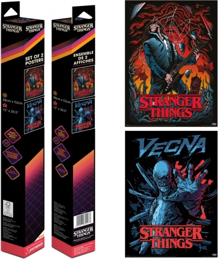 Ten zestaw zawiera dwa różne plakaty o wymiarach 38x52 cm. Idealny dla fanów Stranger Things, którzy chcą ozdobić swoje pomieszczenie lub biuro stylowymi motywami.