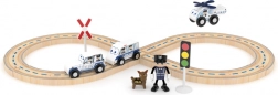 W opakowaniu znajdują się tory oraz 4 policyjne pojazdy, które można dowolnie łączyć i wplatać w tematyczne historie. Zestaw jest kompatybilny ze standardowymi drewnianymi kolejkami, dzięki czemu można go rozbudowywać o kolejne elementy i tworzyć większe trasy.