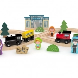 Zawiera łącznie 34 elementy, w tym tory, pociąg, figurki zwierzątek, domek i drzewa.