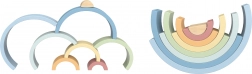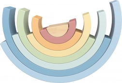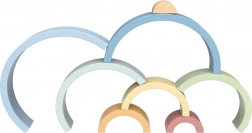 Zestaw zawiera 8 półkolistych elementów w różnych rozmiarach i stonowanych barwach, które można układać w tęczę, mosty, tunele oraz fantazyjne konstrukcje.