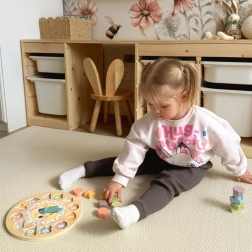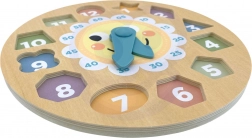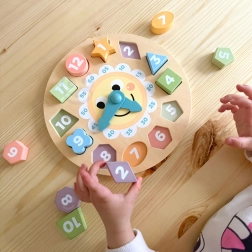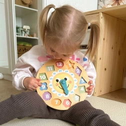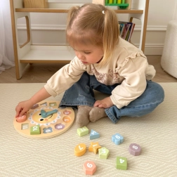 Zegar rozwija małą motorykę, koordynację, percepcję wzrokową oraz logiczne myślenie. Wykonany jest z gładkiego, wytrzymałego drewna bez ostrych krawędzi i pomalowany bezpiecznymi, nietoksycznymi farbami. Dzięki czytelnej skali minutowej dzieci łatwo uczą się podziału godziny na minuty oraz pierwszych zasad czytania zegara.