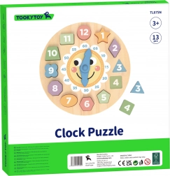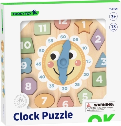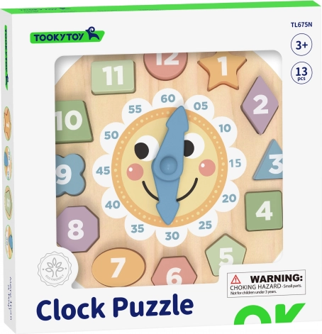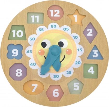 Drewniany zegar edukacyjny TOOKY TOY łączy układankę kształtów z pierwszymi krokami w nauce odczytywania czasu. Dwanaście kolorowych elementów o różnych kształtach z liczbami 1–12 wkłada się w odpowiadające im otwory, a niebieskie, ruchome wskazówki zachęcają do ćwiczenia godzin i minut. Uśmiechnięte słoneczko pośrodku oraz przyjemne pastelowe barwy zapraszają do odkrywania i skupionej zabawy.