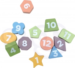 Wyjmowane drewniane elementy o różnych kształtach i kolorach uczą dzieci rozpoznawania kształtów, kolorów i liczb, a także wspierają precyzyjne dopasowywanie i cierpliwość.