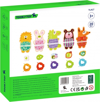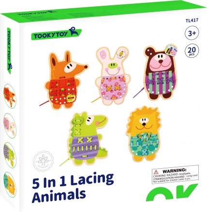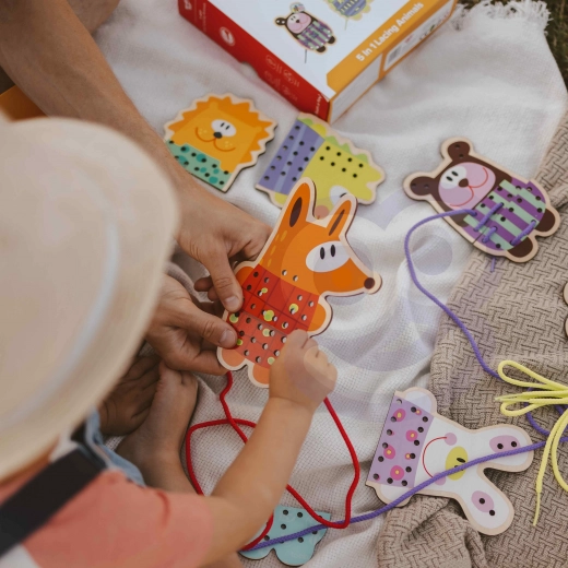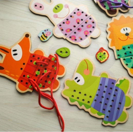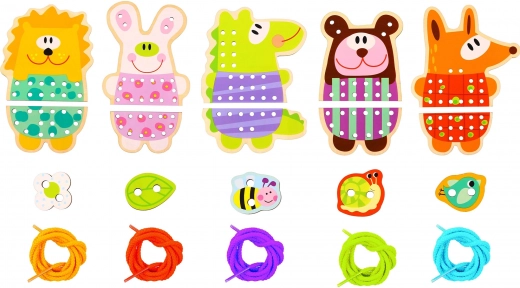 Ten wysokiej jakości drewniany zestaw zawiera pięć ulubionych zwierzątek – liskę, misia, krokodyla, lwa i prosiaczka – a do każdego pasujący mały element do „przyszycia”. Dzięki kolorowym sznurówkom i dobrze widocznym otworom dzieci łatwo opanują prawidłowy chwyt i precyzyjne ruchy.