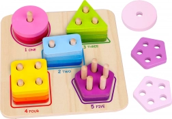 Dzieci sortują kolorowe kształty na właściwe kołeczki i przy okazji uczą się liczyć 1–5 oraz rozpoznawać angielskie nazwy kształtów na podstawie.