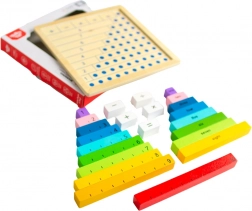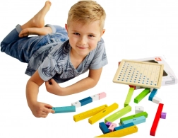 Ten edukacyjny zestaw łączy kolorowe drewniane elementy z cyframi i znakami z praktyczną drewnianą tablicą. Dzieci szybko pojmują relacje między liczbami i proste działania arytmetyczne dzięki układaniu zadań i wizualnym demonstracjom.
