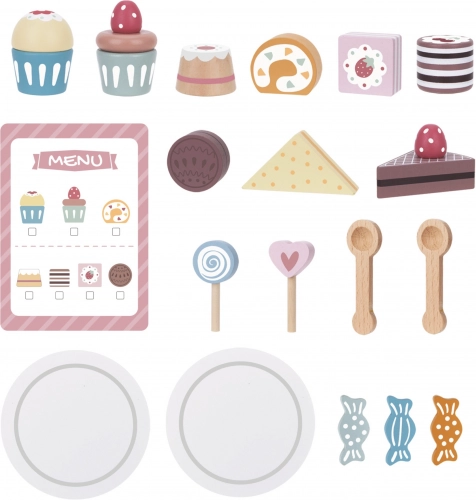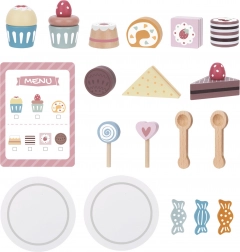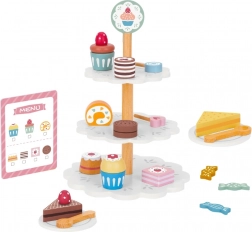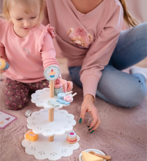 Ten elegancki drewniany stojak w stylu cukierni umożliwia dzieciom realistyczną zabawę w serwowanie. Dzięki 3 poziomom mali cukiernicy mają dużo miejsca na cupcakes, torciki i ciasteczka, a talerzyki i łyżeczki zapraszają na wspólne „popołudniowe herbatki”.