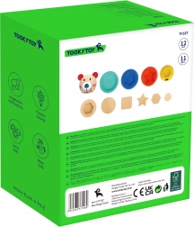 Drewniana piramida z misiem łączy zabawę z nauką. Kolorowe krążki, gwiazdki i inne kształty układa się na patyczku i w odpowiednich miejscach, co wspiera logiczne myślenie oraz wyobraźnię przestrzenną. Dzieci w przystępnej formie opanowują sortowanie według kształtu, koloru i rozmiaru.