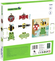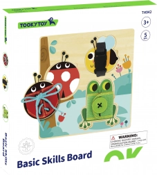 Zabawna drewniana aktywna tablica TOOKY TOY pomaga dzieciom ćwiczyć motorykę małą, koordynację oko–ręka oraz codzienne umiejętności. Kolorowe zwierzątka – pszczółka z klamrą, biedronka ze sznurówką i żabka z guzikiem – motywują do nauki przez zabawę. W zestawie znajduje się także sorter, w którym dzieci dopasowują zwierzątka do właściwych miejsc.