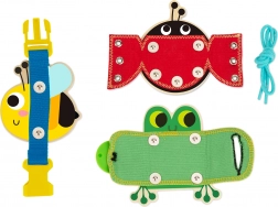 Biedronka ze sznurówką, pszczółka z klamrą oraz żabka z guzikiem uczą dzieci praktycznych umiejętności w formie zabawy i wzmacniają motorykę małą.