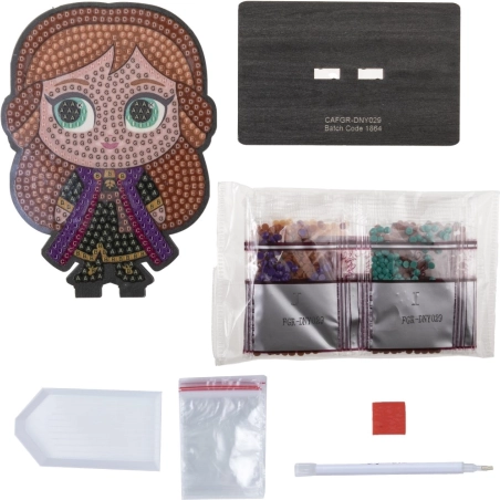 Zawiera drewnianą tablicę z nadrukowanym motywem, aplikator (pióro), miseczkę, wosk i kolorowe kamyczki.