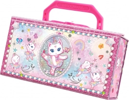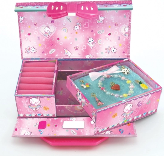 Szkatułka w kształcie kuferka to wspaniały sposób na przechowywanie dziecięcej biżuterii i drobiazgów. Design z kotką dodaje jej uroku, który dzieci uwielbiają.