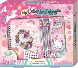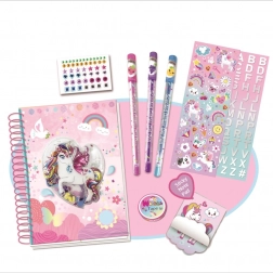 Stwórz własny kreatywny świat z kolorowym zestawem jednorożca, który zawiera pamiętnik, błyszczące długopisy o zapachu oraz zestaw naklejek dla dzieci od 6 lat.