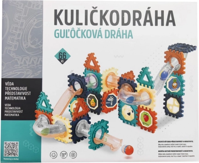 Kreatywny tor kulkowy dla dzieci zawiera 66 elementów do budowania zabawnych i zróżnicowanych tras. Ten zestaw konstrukcyjny wspiera wyobraźnię i orientację przestrzenną podczas tworzenia różnych scen.