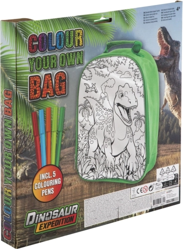 Plecak do kolorowania z motywem dinozaura. Zestaw: plecaczek + 5 permanentnych markerów do własnego projektu. Świetny kreatywny prezent dla dzieci.