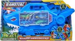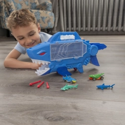 Rekinowy garaż TEAMSTERZ łączy dynamiczną zabawę, przechowywanie i przenoszenie. W środku znajduje się rampa drive-thru, po której auta pędzą prosto przez rekinie szczęki. Zintegrowany wyrzutnik pocisków na głowie rekina dodaje każdej jeździe solidnej dawki adrenaliny.