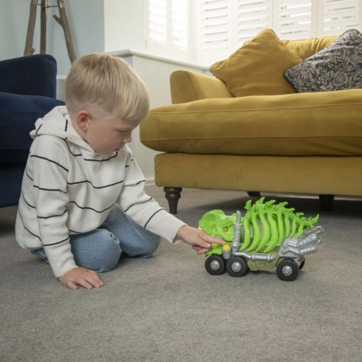 Popchnij auto do przodu i zobacz, jak T‑Rex automatycznie otwiera paszczę dla jeszcze większego efektu akcji.