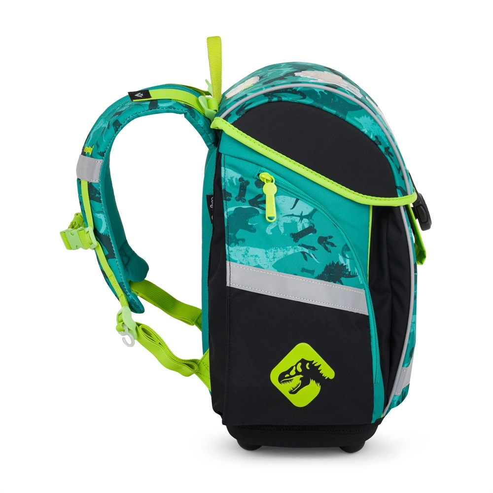 Szkolny plecak Premium Light Dino łączy odciążoną konstrukcję z przemyślaną organizacją na co dzień. Oddychające, wyściełane plecy oraz ergonomicznie ukształtowane, szerokie i miękkie szelki rozkładają obciążenie i zapewniają wygodne noszenie przez cały dzień. Pasy dociągające i pasek piersiowy pomagają idealnie osadzić plecak na plecach.