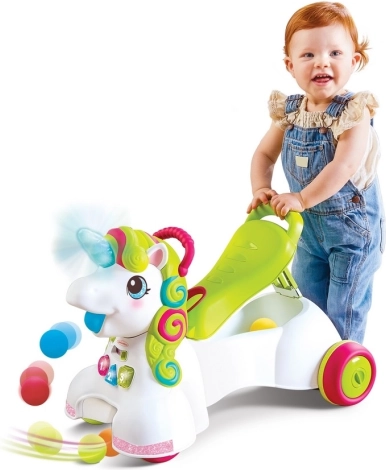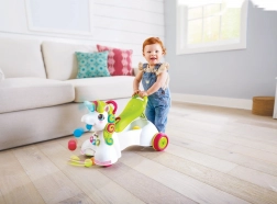 Odkryj wszechstronny jeździk i pchacz 3w1 – jednorożec, który wspiera pierwsze kroki, rozwój motoryki oraz naukę przez zabawę. Dziecko zaczyna od centrum zabawy (ok. 6M+), kontynuuje pchaniem za uchwyt (ok. 12M+), a później przechodzi do jazdy na siedząco (ok. 16M+). Kolorowa grzywa o różnych fakturach stymuluje zmysły, a podświetlane przyciski uczą kolorów, kształtów i liczb.
