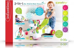 Zabawny jeździk i pchacz 3w1 INFANTINO w kształcie jednorożca rośnie razem z dzieckiem: służy jako centrum zabawy, pchacz i jeździk. Oferuje ponad 20 efektów świetlnych i dźwiękowych, podświetlane przyciski z liczbami, kolorami i kształtami, regulowaną prędkość kół oraz miękki świecący róg reagujący na dotyk. W zestawie znajduje się 5 kolorowych piłeczek i praktyczne schowki.