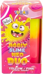 Jiggly Slime Neo Duo to świetny wybór dla dzieci i dorosłych, którzy lubią antystresowe zabawki. Dzięki unikalnej recepturze slime przyjemnie drży, pięknie się rozciąga i pozwala tworzyć bąbelki oraz oryginalne slime-triki. Dwukolorowe wykonanie w neonowej żółci i różu podczas zabawy efektownie łączy się w imponujący odcień.