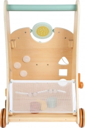 W zestawie znajdują się także zębatki, przekładane tabliczki, układanka z trzema różnymi kształtami oraz zegar z ruchomymi wskazówkami, które zapewniają zabawę i naukę. Praktyczna siatka z tyłu chodzika zapewnia miejsce do przechowywania zabawek. Koła z gumowymi pierścieniami gwarantują cichą i bezpieczną jazdę.