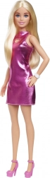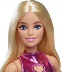 Lalka Barbie ma rozpuszczone blond włosy i różowe sukienki, które są efektowne i słodkie dzięki metalowemu materiałowi i sercowemu wycięciu.