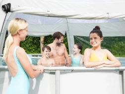 - przy silnym wietrze lub gradzie zdemontować; przy stosowaniu chemii basenowej wietrzyć/otwierać ze względu na opary chloru