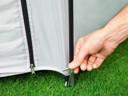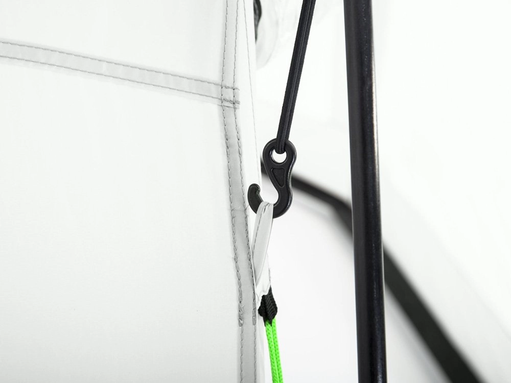 Pręty z włókna szklanego, linki napinające i śledzie pozwalają na złożenie w około 30 minut. Praktyczna torba ułatwia przenoszenie i przechowywanie.