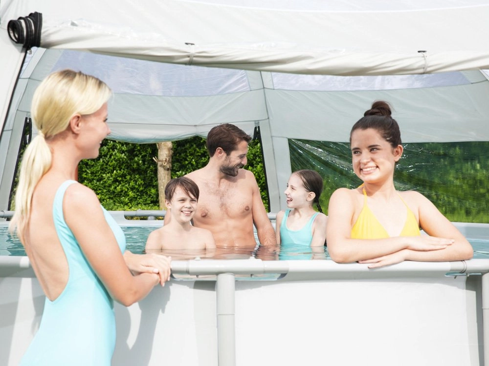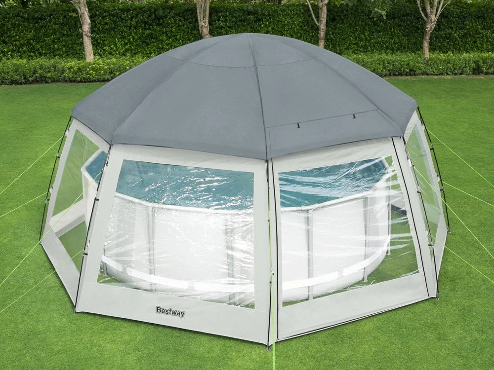 Korzystaj z kąpieli i relaksu bez względu na pogodę. Stabilna konstrukcja z prętów z włókna szklanego podtrzymuje podwójną powłokę z poliestru 190T z laminatem PU 2000 mm i ochroną UV UPF 50+. Przezroczyste okna PVC zapewniają dużo światła, dwie strefy wejściowe i siatka przeciw owadom gwarantują wygodny dostęp i spokój wokół basenu.