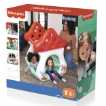 Domek ma radosną kolorystykę z motywem muchomora, co wspiera dziecięcą kreatywność.
