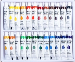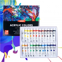 Kompletny zestaw farb akrylowych do hobby i pracowni: 24 intensywne odcienie w praktycznych tubkach 12 ml. Farby są bogato pigmentowane, schną szybko i świetnie trzymają się różnych powierzchni – od papieru i płótna po drewno, szkło i metal. Idealne dla początkujących i profesjonalistów, z tubkami ze śrubowanym zamknięciem zapobiegającym wysychaniu.