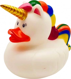 - Unikalny design – biała kaczuszka z tęczową grzywą i ogonem oraz rogiem jednorożca przyciąga wzrok od pierwszego spojrzenia.