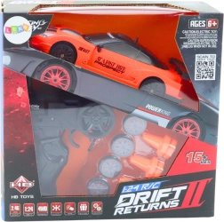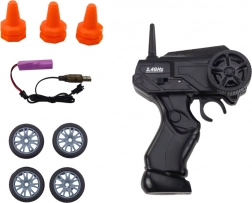 W zestawie znajdują się dwa typy kół – z bieżnikiem dla lepszej przyczepności oraz gładkie koła do efektownego driftu. Stwórz własny tor przy pomocy dołączonych pachołków i trenuj przejazdy przez zakręty oraz slalom. Auto jest zasilane akumulatorem 3,7 V (w zestawie), kontroler wymaga 2× AA (brak w zestawie).