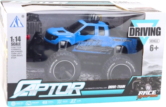 Terenowy samochód RC 1:14 w niebieskim kolorze z kontrolerem 27 MHz, dużymi kołami i akumulatorem z USB. Realistyczne detale, certyfikacja CE/EN71. Dla dzieci od 6 lat.