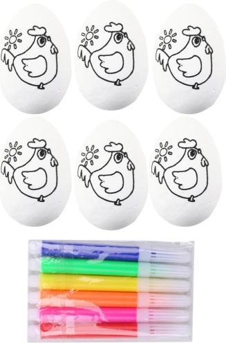 - Wszystko w zestawie – 6 jajek + 6 kolorowych pisaków (żółty, pomarańczowy, czerwony, niebieski, różowy, zielony).