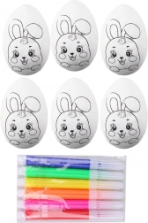 Kreatywny zestaw dla dzieci i dorosłych: 6 styropianowych jajeczek z motywem zajączka oraz kolorowe flamastry do łatwego zdobienia. Idealny do wielkanocnych dekoracji, malowania jajeczek i rozwijania motoryki małej. Jajeczka mają gładką powierzchnię przygotowaną do malowania i zdobienia, dzięki czemu tworzenie jest zabawne, bezpieczne i szybkie.