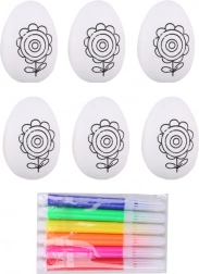 Zestaw zawiera wszystko, czego potrzeba: 6 jajek o praktycznym rozmiarze oraz 6 pisaków w żywych kolorach. Tworzenie wspiera koordynację ręka–oko, zręczność i kreatywność dzieci, a także stanowi świetny pomysł na wielkanocny prezent.