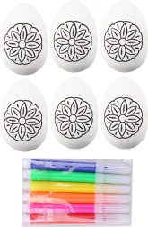 Kreatywny zestaw dla dzieci i dorosłych: 6 styropianowych jajek z motywem kwiatów oraz kolorowe pisaki do łatwego zdobienia wielkanocnych pisanek. Idealny do domowego rękodzieła, do szkoły i przedszkola. Jajka mają gładką powierzchnię, świetnie się kolorują i pomagają rozwijać motorykę małą, kreatywność oraz radość z tworzenia. Doskonałe jako wielkanocne dekoracje i prezent.