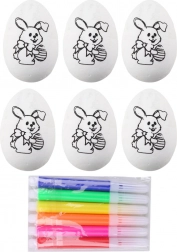 Zestaw zawiera 6 jajek i 6 kolorowych pisaków – żółty, pomarańczowy, czerwony, niebieski, różowy i zielony – więc możesz od razu zaczynać. Tworzenie wspiera motorykę małą, koordynację ręka–oko oraz dziecięcą wyobraźnię.