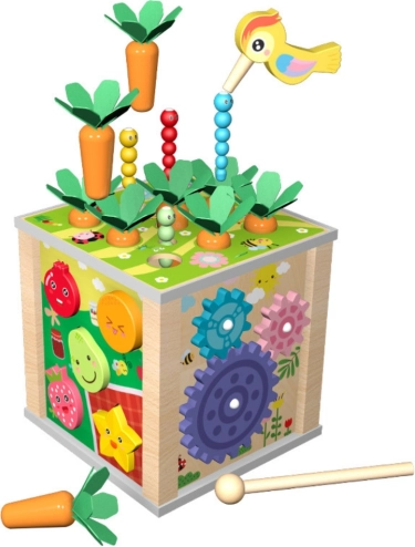 - Sześć różnych aktywności: Zabawka oferuje wyciąganie marchewek, układanie kształtów, grę na ksylofonie, obrotowe zębatki oraz zegar do nauki czasu.