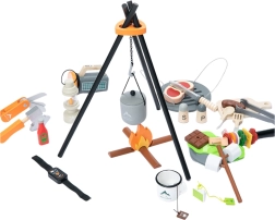 Z tym świetnym drewnianym zestawem do biwakowania dzieci będą się doskonale bawić zarówno w domu, jak i na zewnątrz. Realistyczne akcesoria umożliwiają zabawę w kemping – od rozpalania ognia po przygotowywanie posiłków. Zestaw zawiera plecak, latarnię, szczypce do grilla i inne narzędzia, które wspierają rozwój umiejętności manualnych oraz poznawczych.