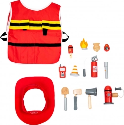 W skład zestawu wchodzą kask strażacki, kostium, gaśnica oraz inne zabawne akcesoria, takie jak megafon i krótkofalówka.