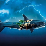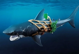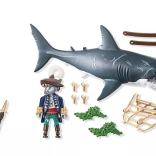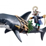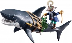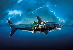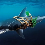 Ogromny rekin z piratem od PLAYMOBIL przynosi dzieciom porywające opowieści z głębin oceanu. Wystarczy pociągnąć za dźwignię, a gigantyczna paszcza się otworzy, gotowa „schwytać” zdobycz; po zwolnieniu automatycznie się zamyka. Figurka pirata trzyma się sieci, jest uzbrojona w szablę i noże i jest gotowa na każdą morską potyczkę.