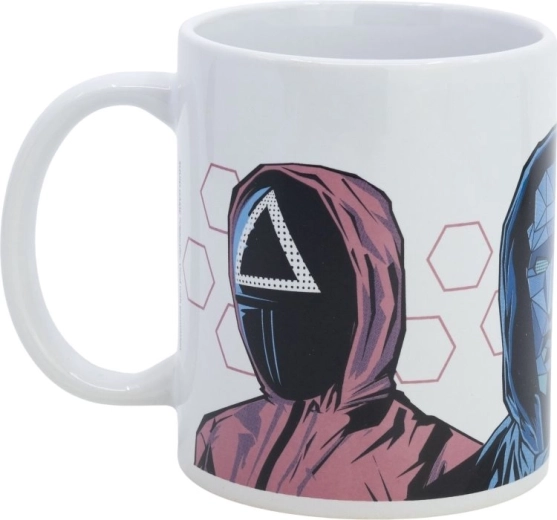 Stylowy ceramiczny kubek z motywem Squid Game o pojemności 325 ml ucieszy fanów kultowego serialu. Dostarczany w ozdobnym pudełku, idealny jako prezent i do codziennego użytku.