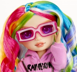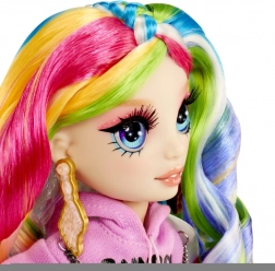 Amaya Raine zachwyca wyrazistymi, tęczowymi włosami, bluzą z napisem RAINBOW i błyszczącą spódnicą. Dzięki ruchomym stawom świetnie pozuje i bawi.